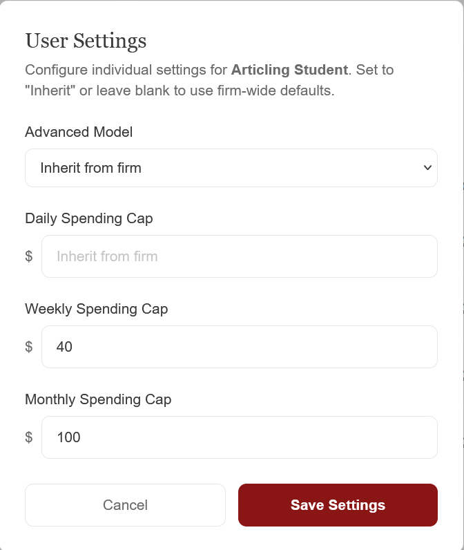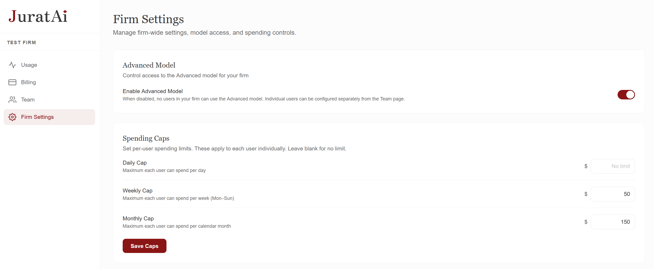 A web console for managing your firm's seats, spending caps, and storage — without ever touching billable time.